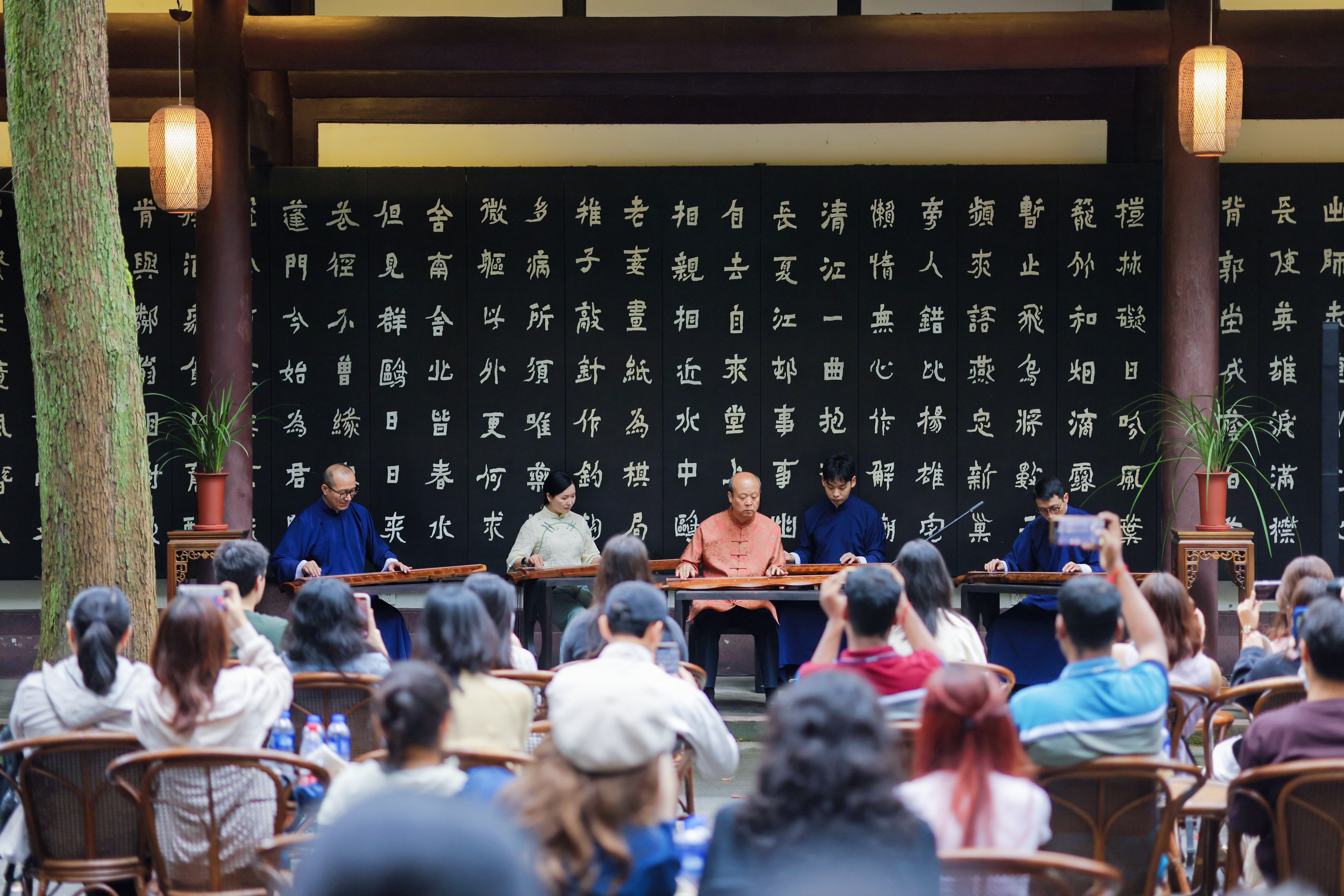 在浣花溪畔的成都杜甫草堂博物馆中,一场“中秋听琴——草堂古琴雅集”之约,让中外游客都沉浸在这充满东方韵味的场景里。中秋当日,金桂飘香漫过庭院,指尖拨弦声淌入耳畔,观众静坐其间,感受古人“对月抚琴”的雅致。